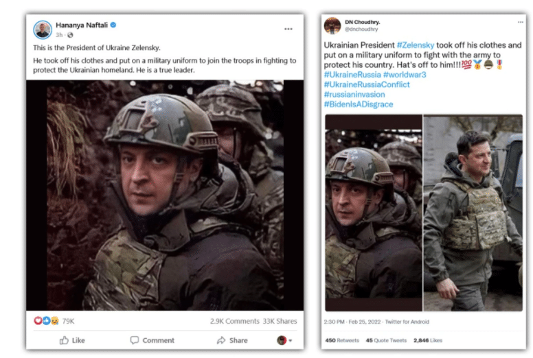 A similar incident happened with the Ukranian President Volodymyr Zelensky who in a speech on February 25 announced his pledge to remain in Kiev. Soon after his speech, several images with Zelensky in military uniform went viral in social media platforms, claiming that he was at the frontlines of war. One of the images got more than 33,000 shares on Facebook in just a few hours.