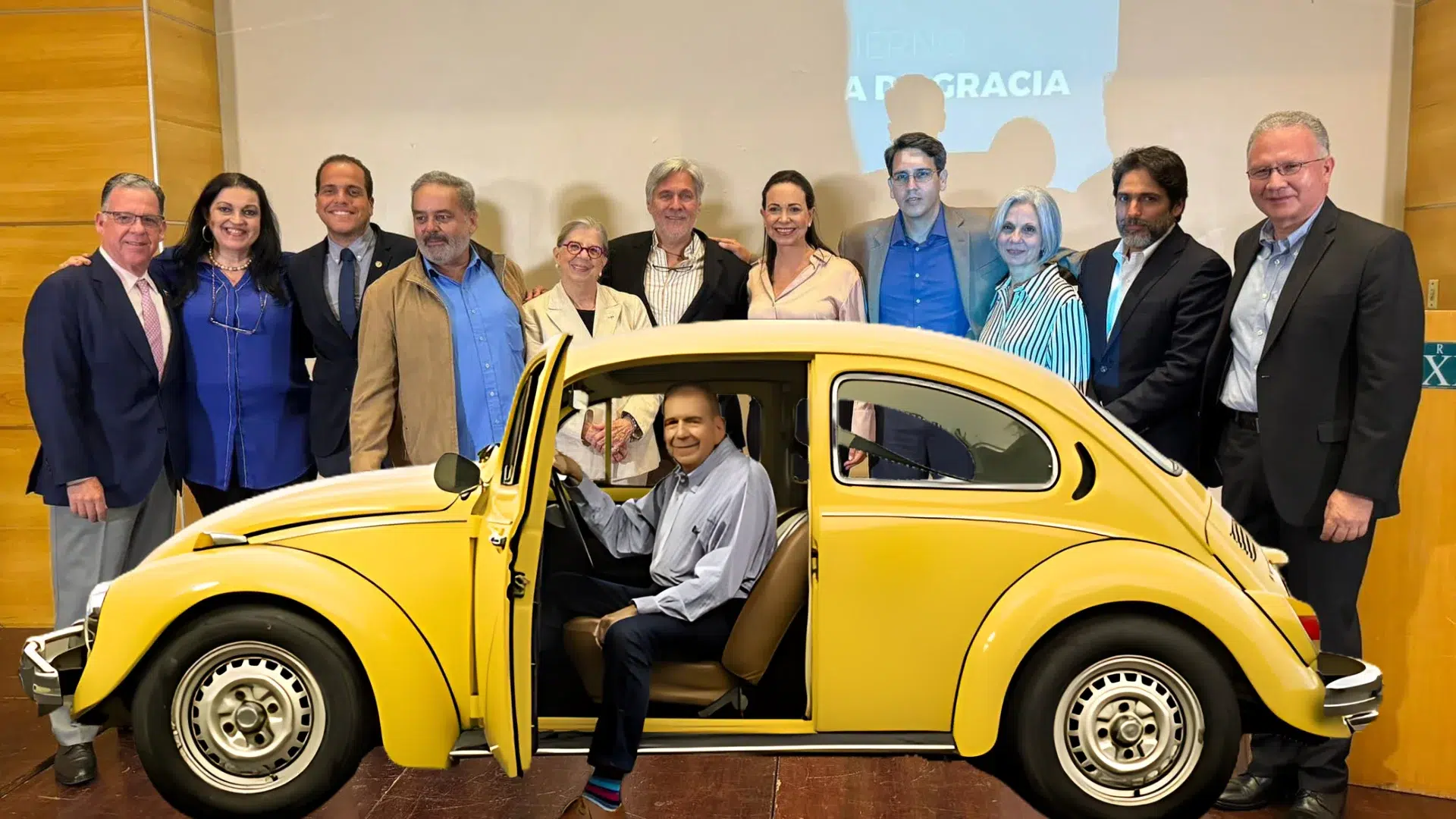 Venezuelan far-right presidential candidate Edmundo Gonzalez on the driver seat of a yellow Volkswagen Beetle, a campaign photo aimed at showing some connection to ordinary Venezuelans. In the background Maria Corina Machado and the creators of the "Land of Grace" neoliberal plan during its presentation in October 2023. Photo: X/@EdmundoGU and Vente Venezuela with image edition by Orinoco Tribune.