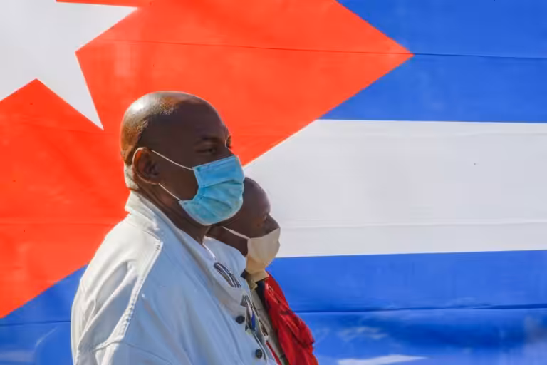 Featured image: Cuban couple wearing face masks with the Cuban flag in the background. Photo by PAHO.