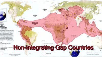 The aforementioned Pentagon plan for the planet is based on the binary division between North (“the Functioning Core”) and Sur (“Non-Integrating Gap”). In the map below, taken from a presentation by Barnett in 2003, we can see that at the top are the countries of the so-called “First World”, where large private capital and business are concentrated and political stability is intended to be reserved; in the lower part, in red, the “Third World” is drawn, an entire region that would be destined, according to the US military, to “balkanize”, that is, to be dismembered territories, absorbed in chaos, from which wealth is captured by great central capitals of the North for their own opulence.