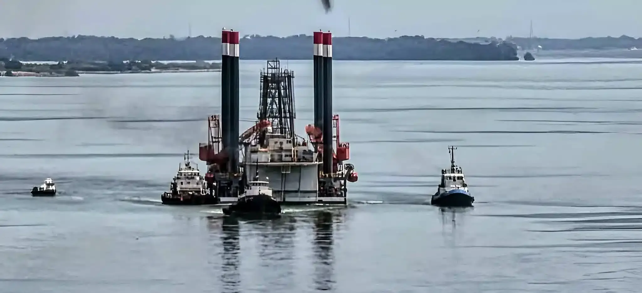 The Alula platform, a self-elevating offshore platform, departed from the Chinese port of Zhoushan, passed under the Lake Maracaibo bridge, guided by a tugboat, and headed for its final location in Lagunillas.