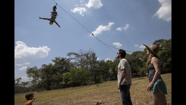 In this Feb. 16, 2019 photo, a guest hangs on a zip line prior to a wedding party in La Llanada, a summer camp at the Camburito Hacienda in Acarigua, Venezuela. After a breakfast of traditional stuffed corn-patty arepas, some guests went wall climbing, rode horses and played Bocce ball. (AP Photo/Rodrigo Abd)