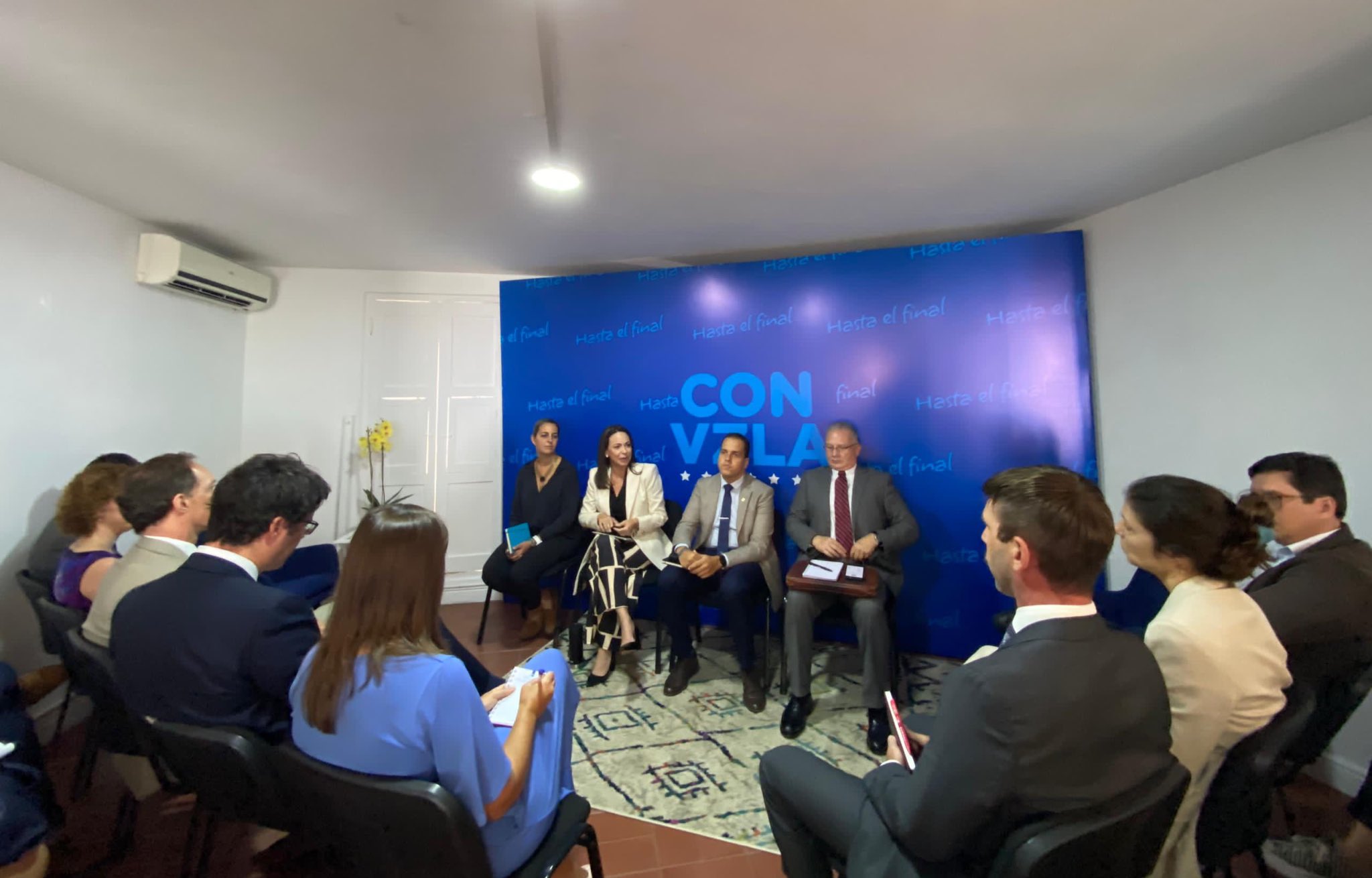 Venezuelan opposition politician MarĂa Corina Machado seated next to her advisors, speaking in front of foreign diplomats in Caracas on Wednesday, October 25, 2023. Photo: X/MariaCorinaYA.
