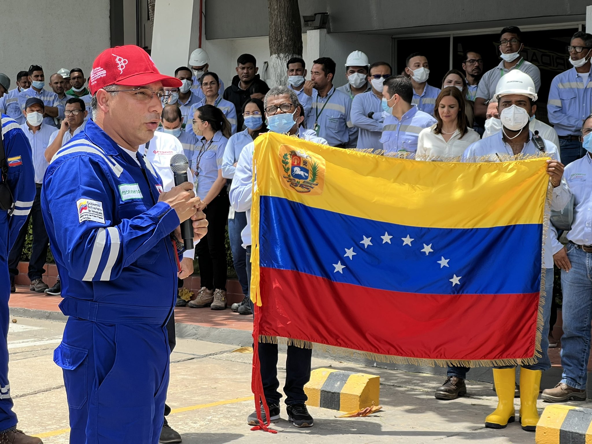 Pequiven President Pedro Rafael Tellechea during a worker's assembly at Monómeros headquarters in Barranquilla, after Venezuela officially regained control of the important asset. Photo: Twitter/@BorisCastellano.