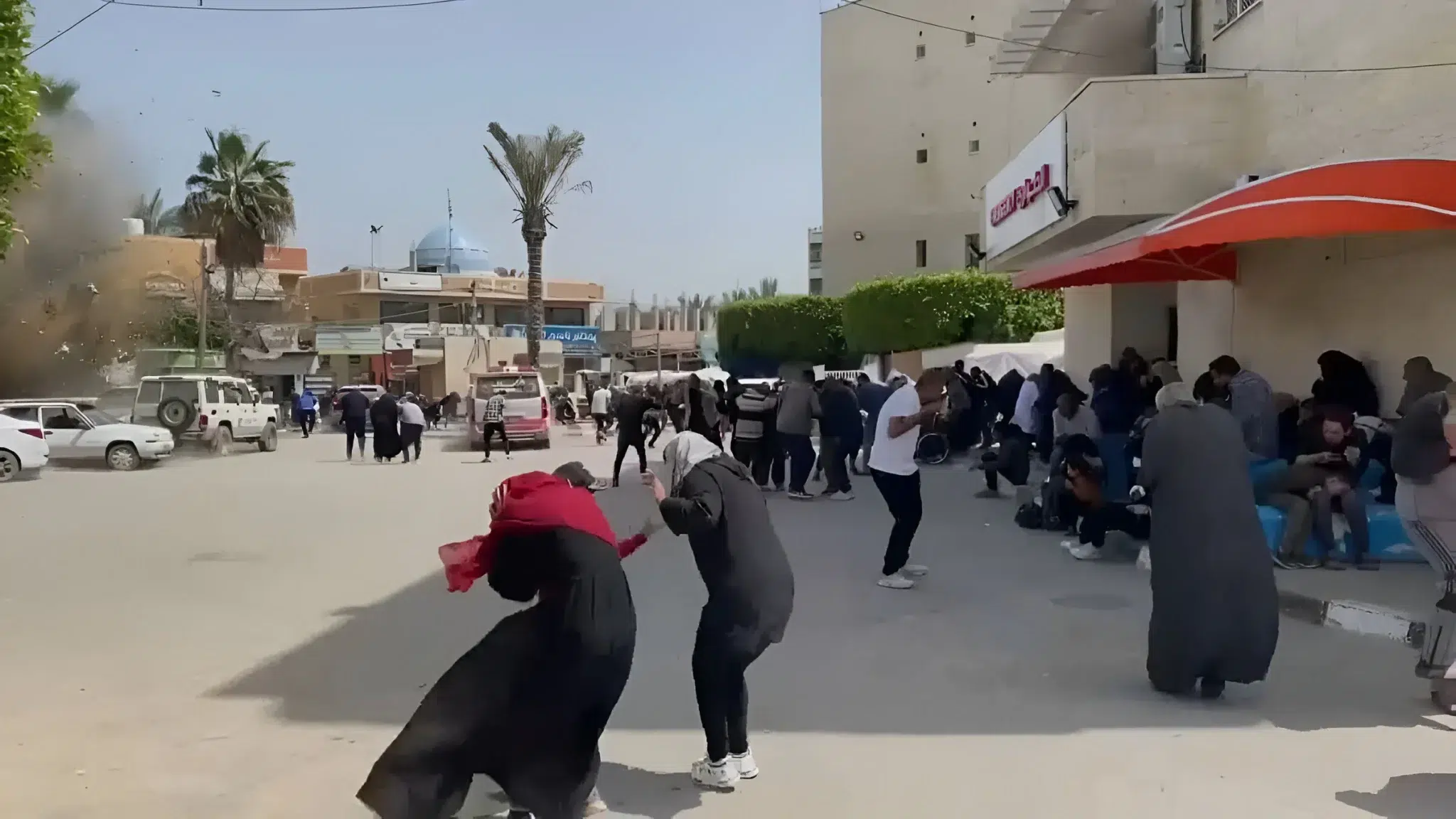 People covering themselves immediately after the blast caused by the Israeli bombing next to the Al-Aqsa Martyrs’ Hospital in Deir Al-Balah, in central Gaza, Palestine on Sunday, March 31, 2024. Photo: Screenshot of social media video by @PalestineChron.