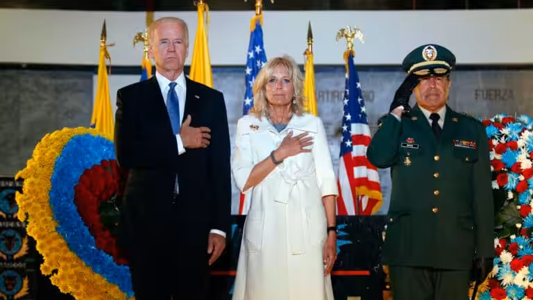 Vice President Joe Biden, left, his wife, Dr. Jill Biden, center, and Colombia's Commander of the Armed Forces Alejandro Navas, stand for the Colombian national anthem during a ceremony to honor Air Force servicemen fallen on the line of duty in a chapel at the Air Force base in Bogota, Colombia, Monday, May 27, 2013. (AP Photo/Fernando Vergara)