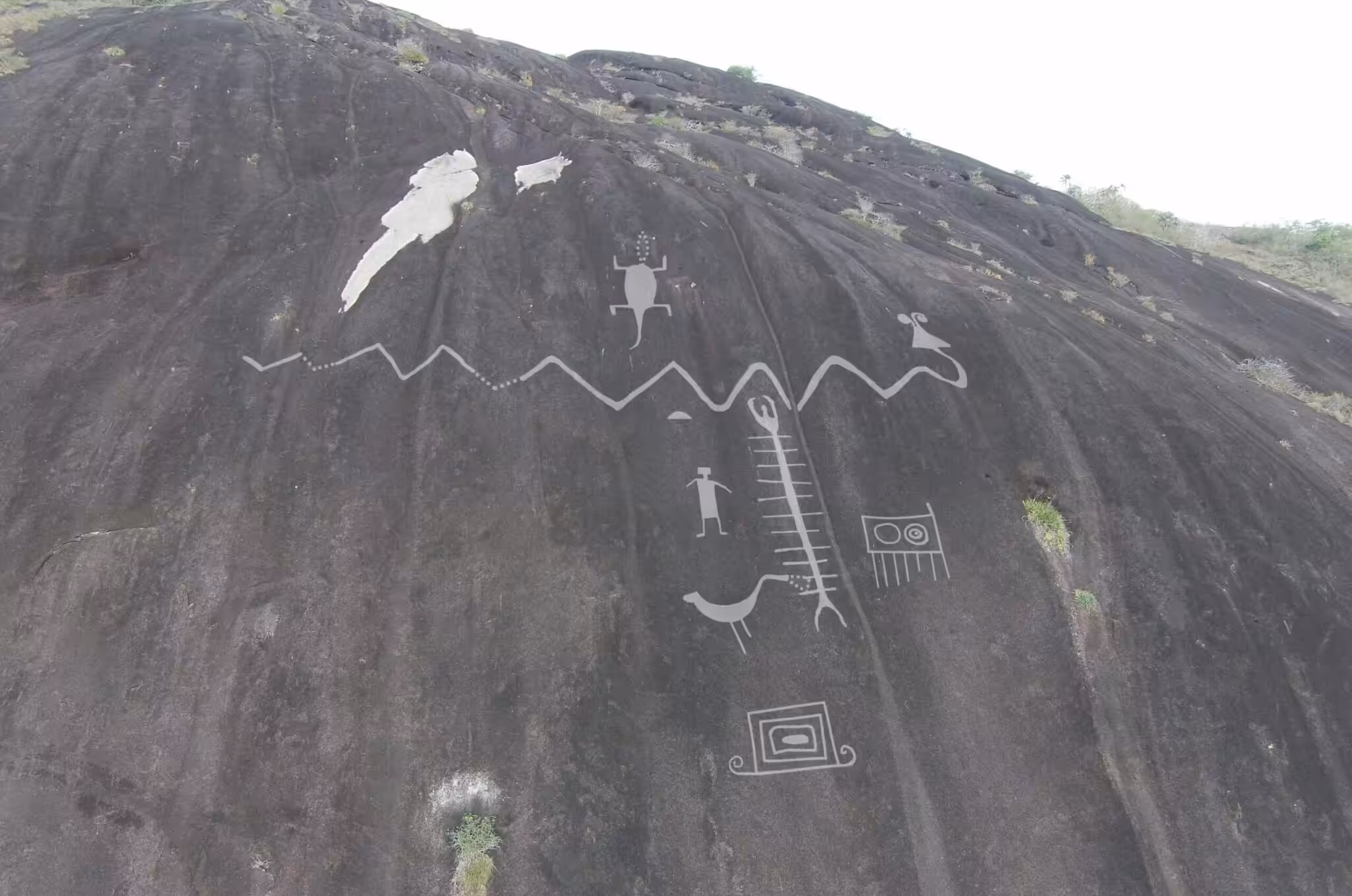 Aerial photograph of monumental Cerro Pintado petroglyphs with enhanced image overlay, 2017. Photo: Philip Riris/file photo.
