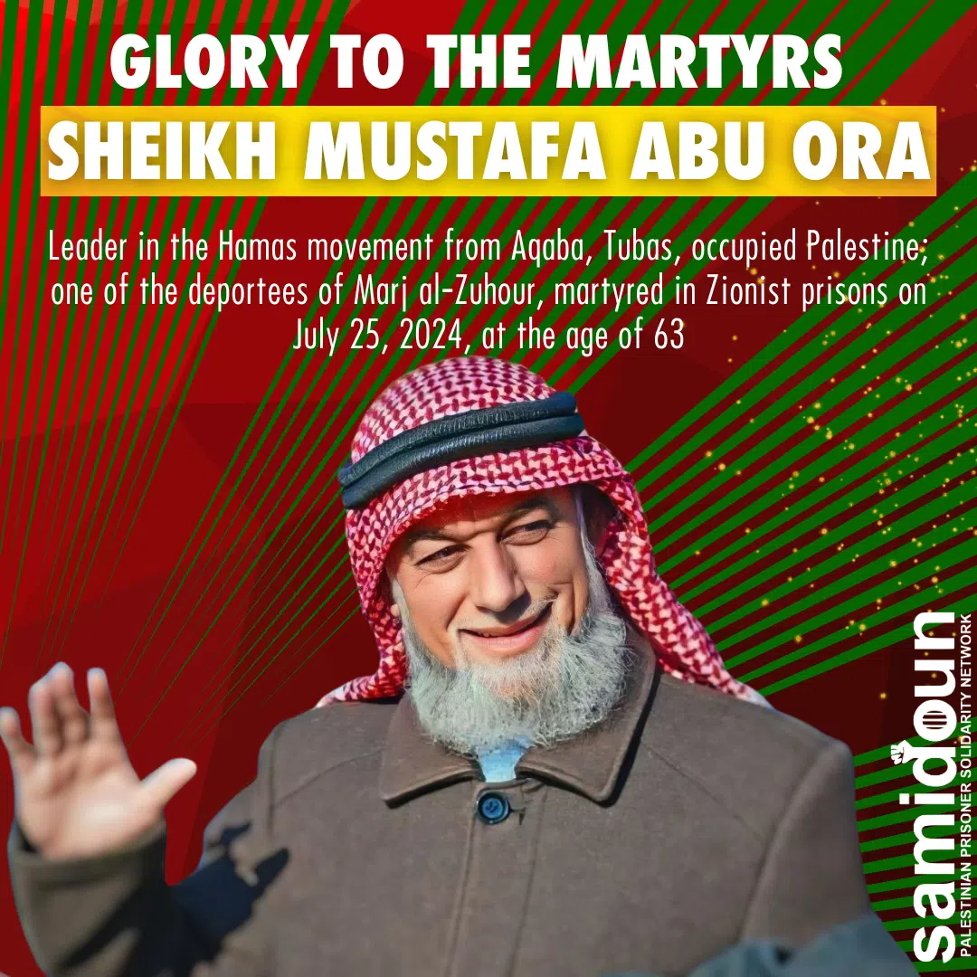 Samidoun Palestinian Prisoner Solidarity Network joins Palestinian political parties, resistance movements and prisoners’ organizations in saluting the martyr Sheikh Mustafa Mohammed Abu Ora, 63, a leader in Hamas, the Palestinian Islamic Resistance Movement, from Aqaba, Tubas, occupied Palestine, who was martyred in Zionist prisons on Thursday, July 25, 2024. This makes Sheikh Abu Ora the 19th documented martyr inside the Zionist prisons since the beginning of Al-Aqsa Flood and the Zionist genocide in Gaza, and the 255th documented martyr of the prisoners’ movement. However, there are dozens (at least 36) of Palestinian detainees who have been martyred under severe torture and abuse after being abducted from Gaza by the genocidal occupation army in the past ten months, whose identities have been hidden from the Palestinian, Arab and international public.