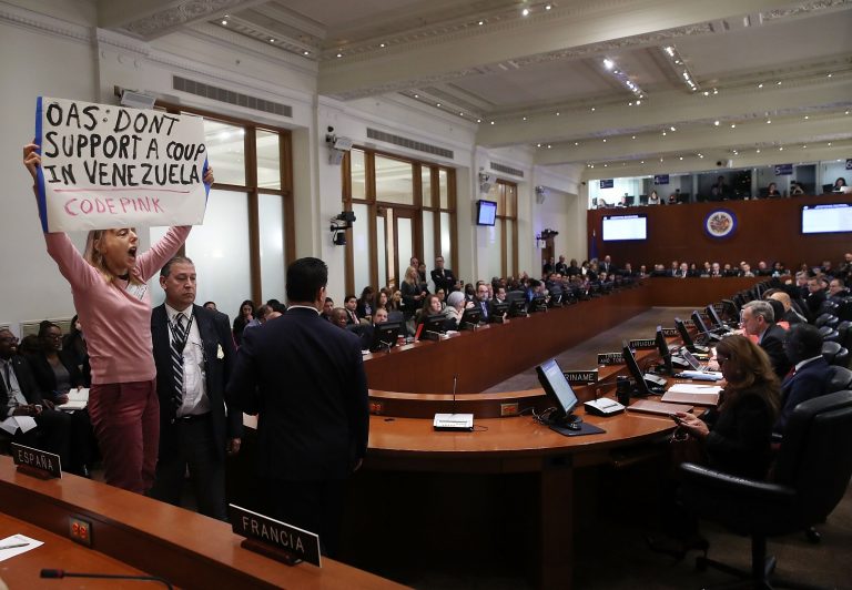 WASHINGTON, DC - JANUARY 24: Code Pink protester Medea Benjamin disrupts a meeting of the Council of the Organization of American States (OAS), on January 24, 2019 in Washington, DC. The meeting was held at the request of the Permanent Missions of Argentina, Brazil, Canada, Chile, Colombia, Costa Rica, the United States and Peru to consider recent developments in Venezuela. (Photo by Mark Wilson/Getty Images)