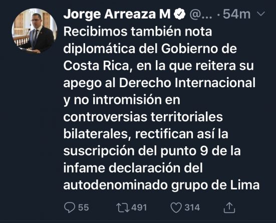 Later, in the Caracas afternoon Minister Arreaza also made public reception of Diplomatic Note from the government of Costa Rica rectifying their position.