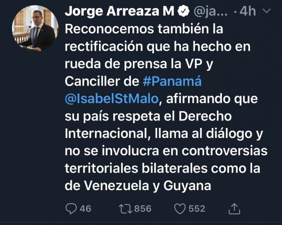 Also, Arreaza celebrated the words of the vice president and foreign minister of Panama, Isabel de Saint Malo, who affirmed that her country “respects international law, calls for dialogue and does not engage in bilateral territorial disputes such as those of Venezuela and Guyana.”