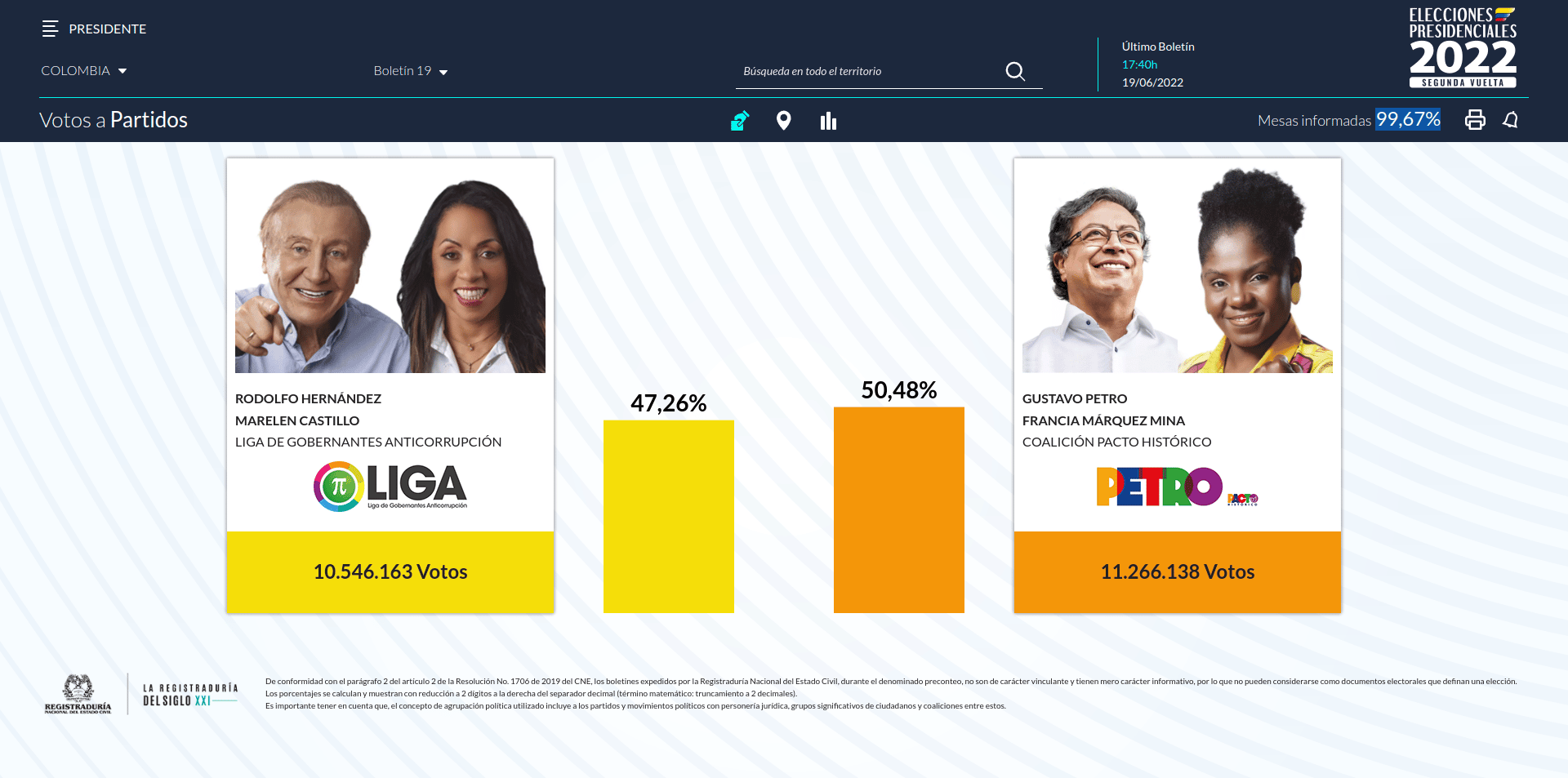 The preliminary results on the electoral pre-count of the National Registry of Colombia reveal that presidential candidate Gustavo Petro, of the Historical Pact, is ahead of his opponent Rodolfo Hernández, of the League of Governors against Corruption. With 99.67% of the votes counted, the center-left politician, with 50.48%, obtained the advantage over Hernández, who partially accumulated 47.26%.