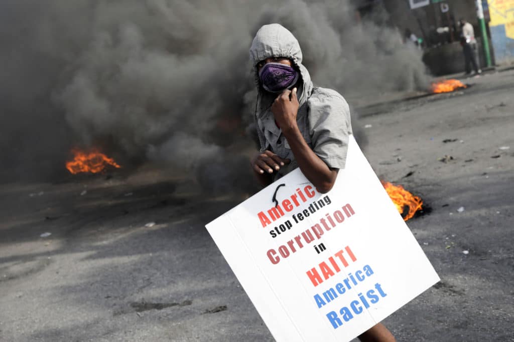 A Haitian protester holds a placard condemning the US domination of Haiti, in capital Port-au-Prince, on October 4, 2019. Photo: Reuters/Andres Martinez Casares .
