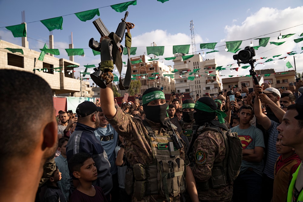 A Palestinian Resistance fighter from al-Qassam Brigades holds a rifle seized from Israeli occupation forces during an arms show for the group at the Nuseirat refugee camp. central Gaza Strip, Palestine , on June 30, 2023. Photo: AP.