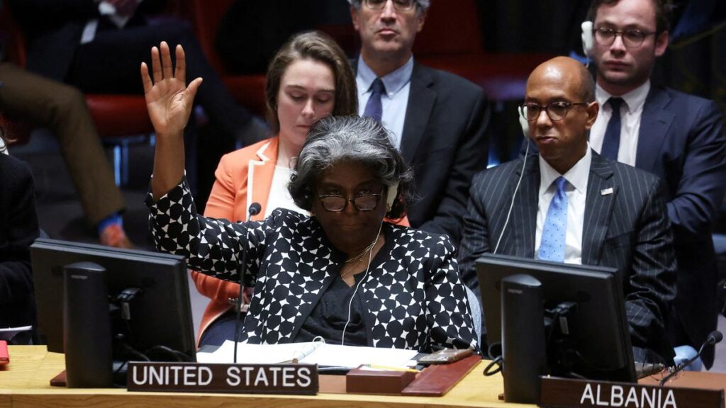 US Ambassador to the United Nations Linda Thomas-Greenfield votes against a Brazil-sponsored draft resolution during a meeting of the United Nations Security Council on the conflict between Israel and Palestine at UN headquarters in New York on October 18, 2023. Photo: Reuters.