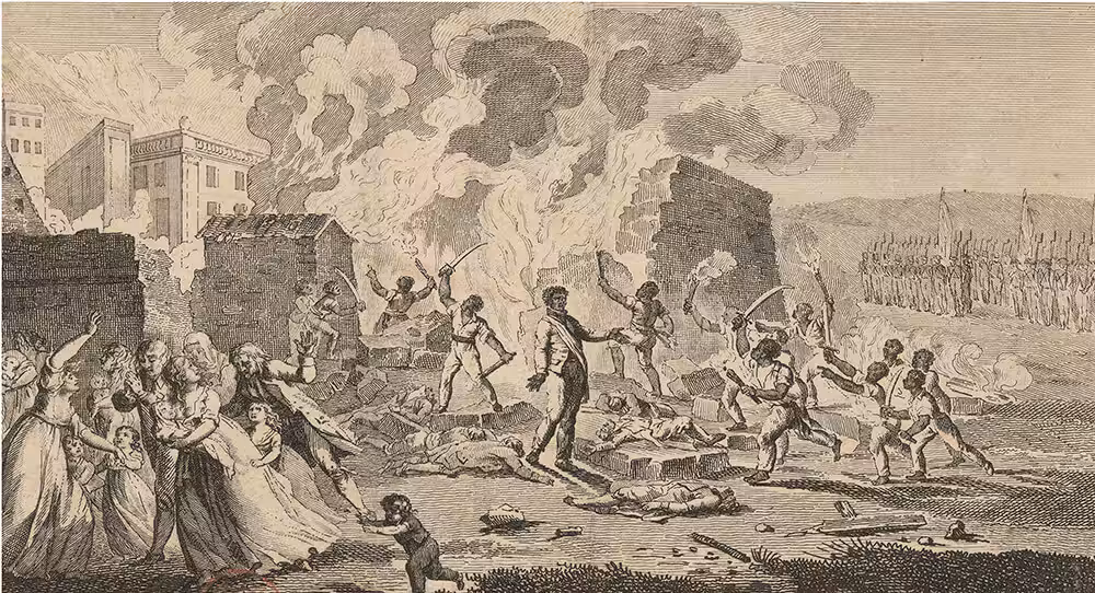 This frontispiece from the 1802 novel, “’Incendie du Cap, ou Le règne de Toussaint-Louverture” (“The Burning of the Cap, or the Reign of Toussaint-Louverture”) by French novelist René Périn, has become one of the most recognizable depictions of the Haitian Revolution, becoming a piece of propaganda that deligitimized the revolution and attacked its leader, Toussaint Louverture, who Périn described as an “atrocious negro” of whom he wished to “offer a portrait upon which, reader, you may be forced to shed many tears!!!” The illustration depicts a well-dressed Toussaint-Louverture presiding over the merciless massacre of innocent whites, many of them women and children. Photo: Race.Ed/University of Edinburgh.