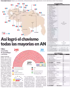 By obtaining 130 nominal deputies and 36 from the national list, Chavismo secured the qualified majority of three-fifths of Parliament (166 deputies) and, with the addition of the 79 deputies obtained so far in the 22 regional lists with “stable results” (where a change in the trend is deemed impossible), the GPP obtained a qualified majority of two-thirds (185 deputies).
