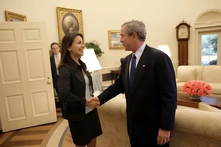 President George W. Bush welcomes Venezuelan opposition politician Maria Corina Machado to the Oval Office. Tuesday, May 31, 2005. Photo: Eric Draper/White House/file photo.