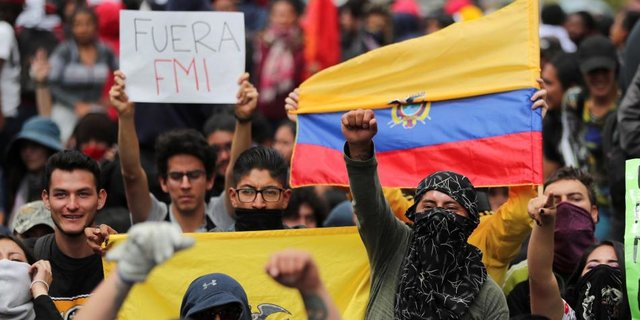 Protesters in Ecuador in 2019 holding a Fuera IMF [IMF get out] banner and the Ecuadorian flag, rallying against then President Lenin Moreno's submissive position towards the IMF. File photo.