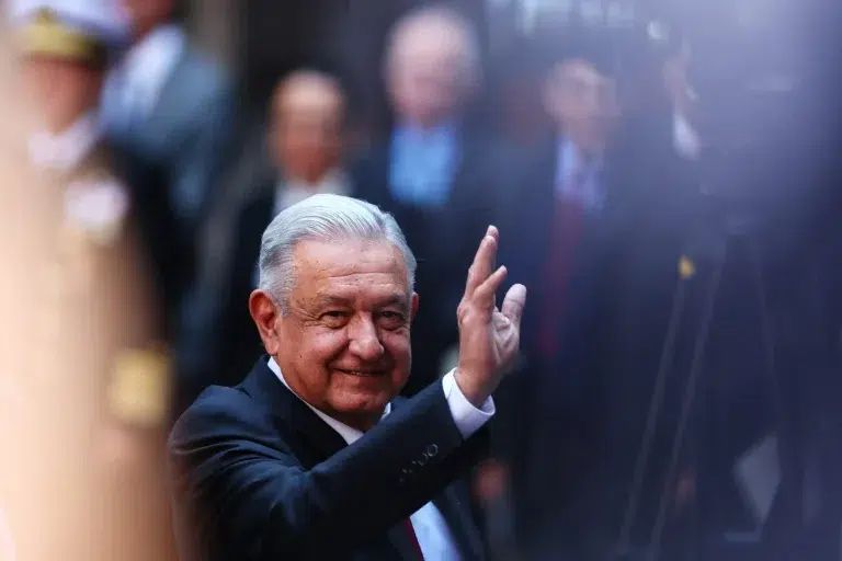 Andres Manuel Lopez Obrador, President of Mexico waves during the signing of a memorandum of understanding Between Mexico and Canada as part of the '2023 North American Leaders' Summit at Palacio Nacional on January 11, 2023 in Mexico City, Mexico. Photo: Manuel Velasquez/Getty Images.