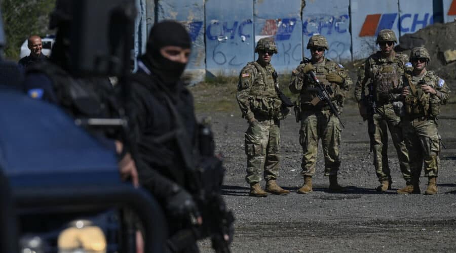 US NATO soldiers patrol next to Kosovo police near the border between Kosovo and Serbia on October 2, 2021. Photo: Armend Nimani/AFP.