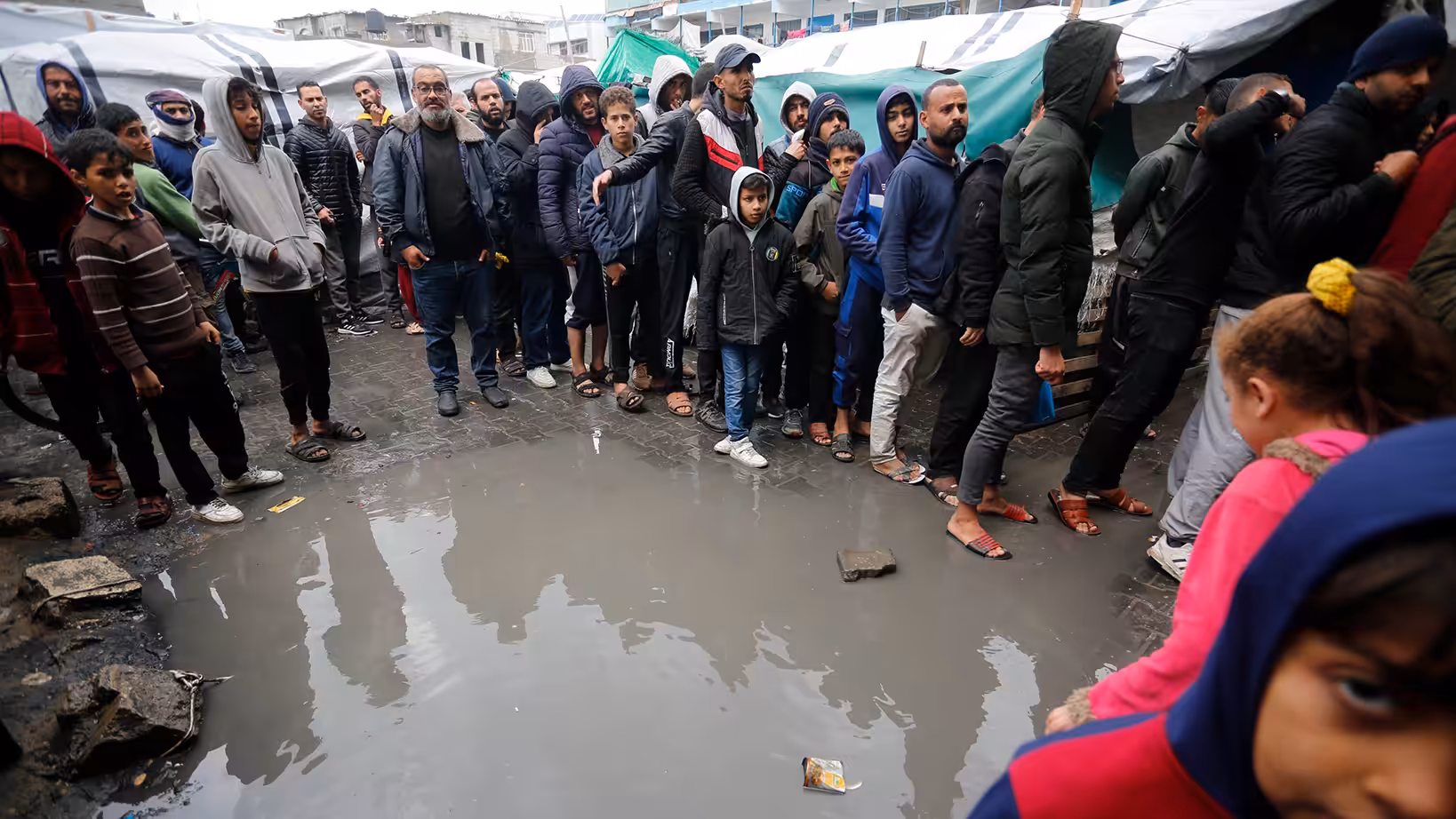 Palestinian refugees in line for food in the rain outside the shelter in Deir al-Balah. Photo: UNRWA.