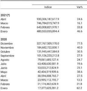 A comparison between April 2020 and April 2021 shows a small decrease in the inflation figures. In April 2020 an inflation rate of 27.5% was recorded.