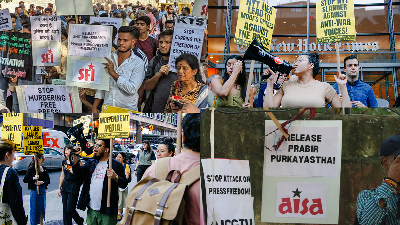 Protests in New Delhi and New York City decrying the raid and detention of journalists in India. Photo: Peoples Dispatch.