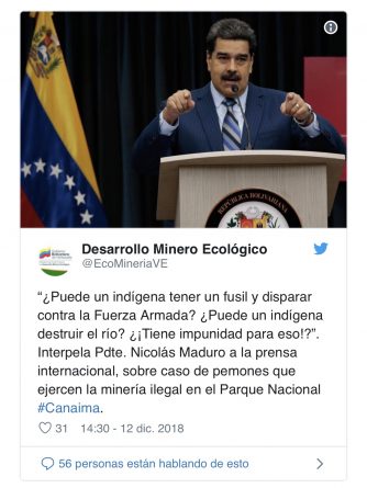 We, as a State, legalize, formalize the miner, give them the legal tools, provide them with scientific-academic training, information on how mining is carried out by applying technologies that have the least impact on the environment. If you [as] Venezuelan, be Pemón or Creole as they say, you want to do mining, we assign spaces for you to do it within the Mining Arc. The Orinoco Mining Arc is a strategy to generate sovereignty of Venezuela in regard to the minerals present in its territory.