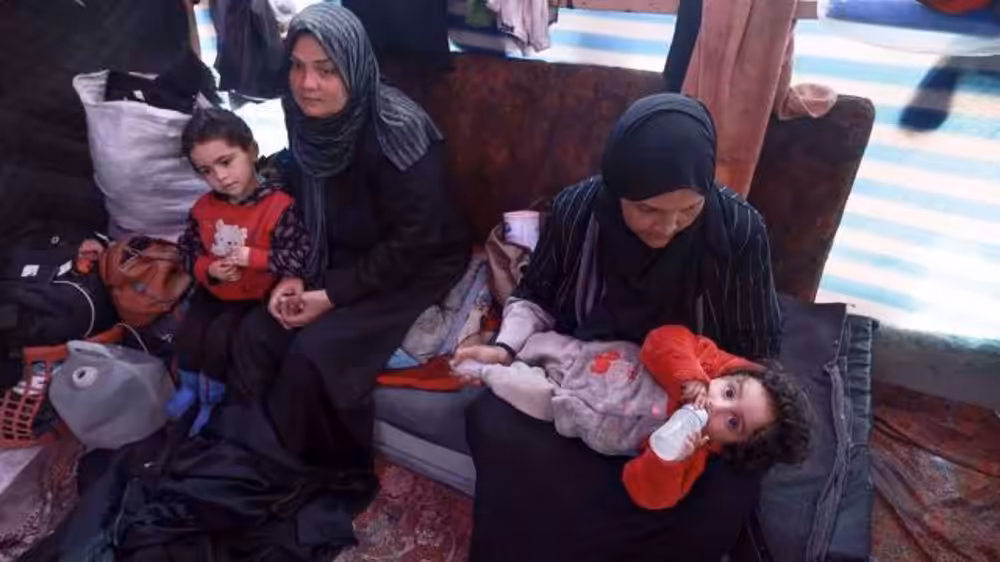 Displaced Palestinian women take care of their children inside a tent in Rafah in the southern Gaza Strip on 7 March 2024, on the eve of International Women's Day, amid Israel's ongoing genocidal war on the besieged strip. Photo: AFP.