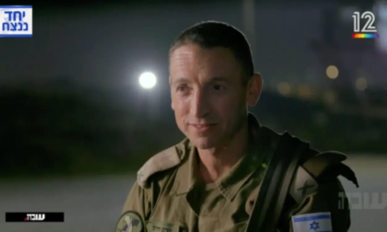Brigadier General Barak Hiram on Israeli media casually admitting the war crimes he committed, such as killing 12 Israeli civilians (including children) in their homes. Photo: Uvda.