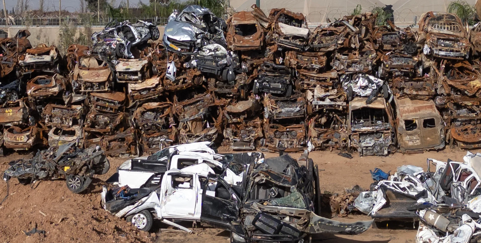 Vehicles stacked up near the southern Israeli town of Netivot, near Gaza, in November 2023. They were destroyed soon after Palestinian fighters began taking captives on 7 October. A new investigation by Israeli journalists has concluded that 70 such vehicles were blown up by Israeli fire. Photo: Jim Hollander/UPI.