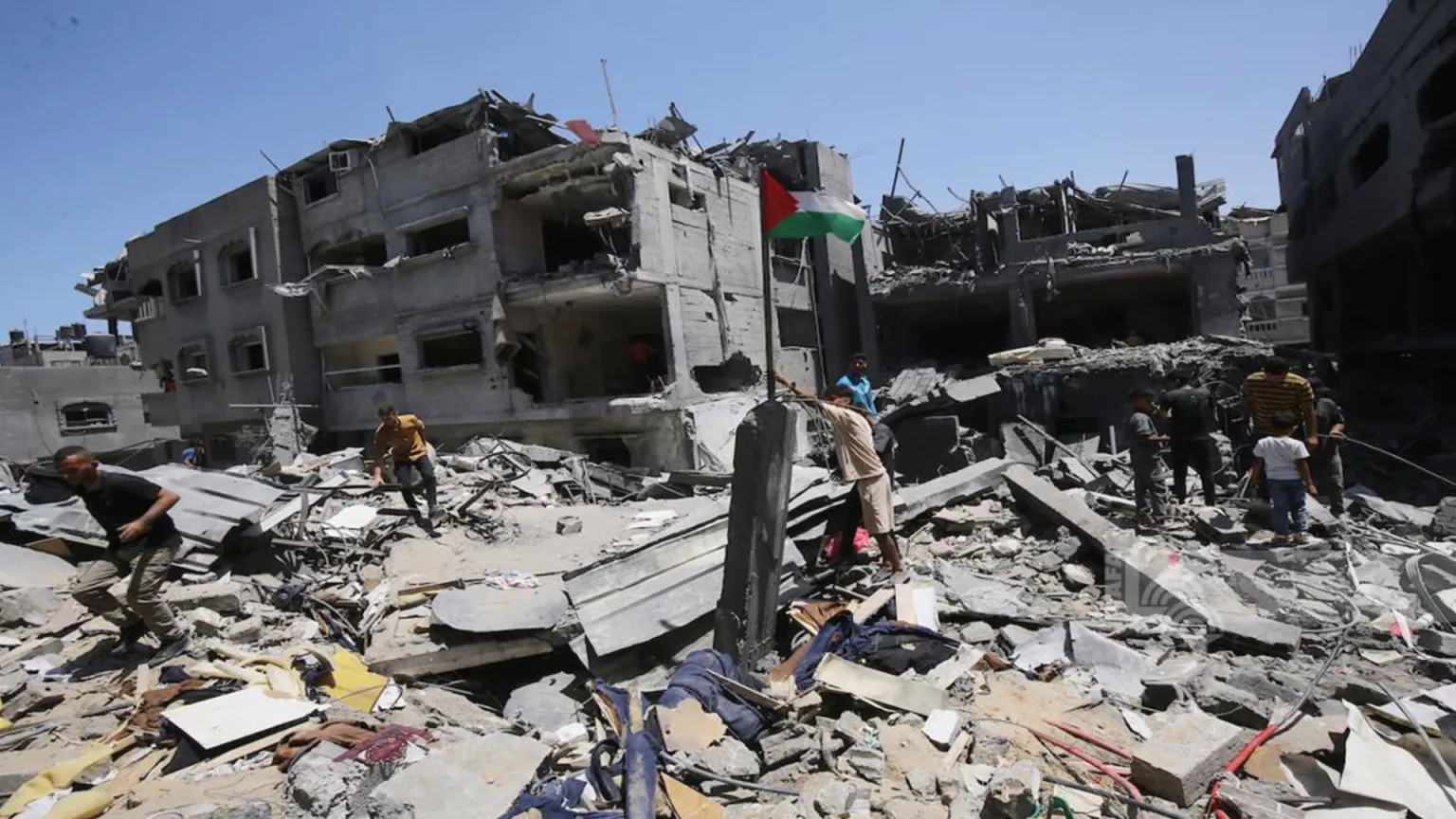 People raise a Palestinian flag next to their house destroyed by an Israeli airstrike in the Bureij refugee camp in the southern Gaza Strip. Photo: Mohammed Sable/EFE.