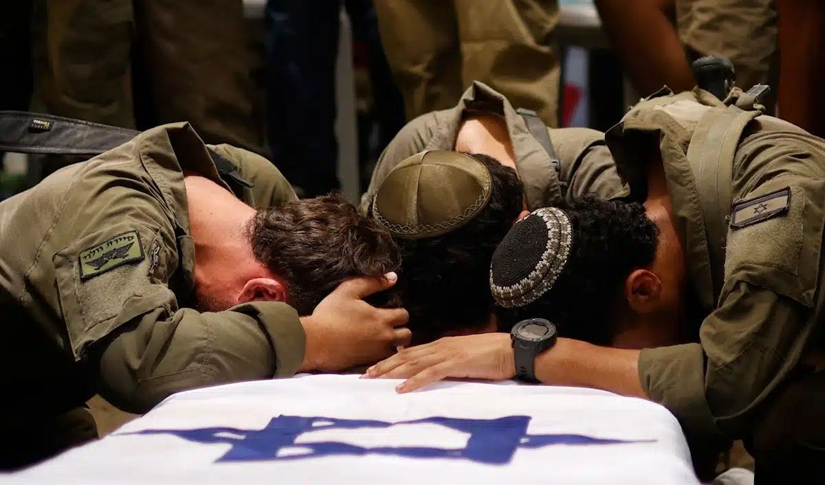 Israeli occupation soldiers mourn over the coffin of a companion killed in the Gaza battlefield. Photo: AFP.