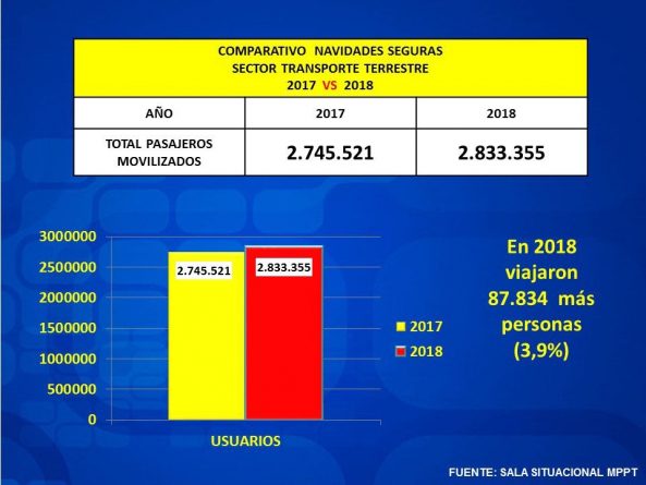 A total of 3,484,661 travelers were mobilized using public transport from December 1 to 31 of the last month of 2018 as part of the holiday season, reported this Friday the Vice President for Communication, Culture and Tourism, Jorge Rodríguez. He also noted that 95,460 Venezuelans entered the country from Colombia, the vast majority to settle back in Venezuela, which he described as a “Return to the Homeland Plan financed by the very people who decided to return.” Of these, 2,833,355 people used land transportation, 487,435 used air transport and 163,871 used water transport, said the minister of communication.