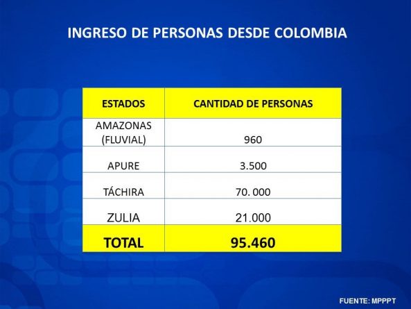 Of these, 960 entered through the state of Amazonas, 3,500 through Apure, 70,000 through Táchira using public transport, and 21,000 through Zulia state.