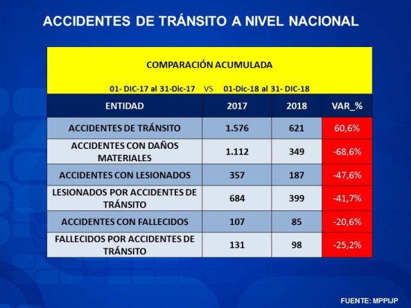 The Venezuelan Vice President of Communication also reported that traffic accidents decreased by 60.6% during the Christmas season, and that accidents with property damage decreased by 68.6%, while accidents with injuries by 47.6% .