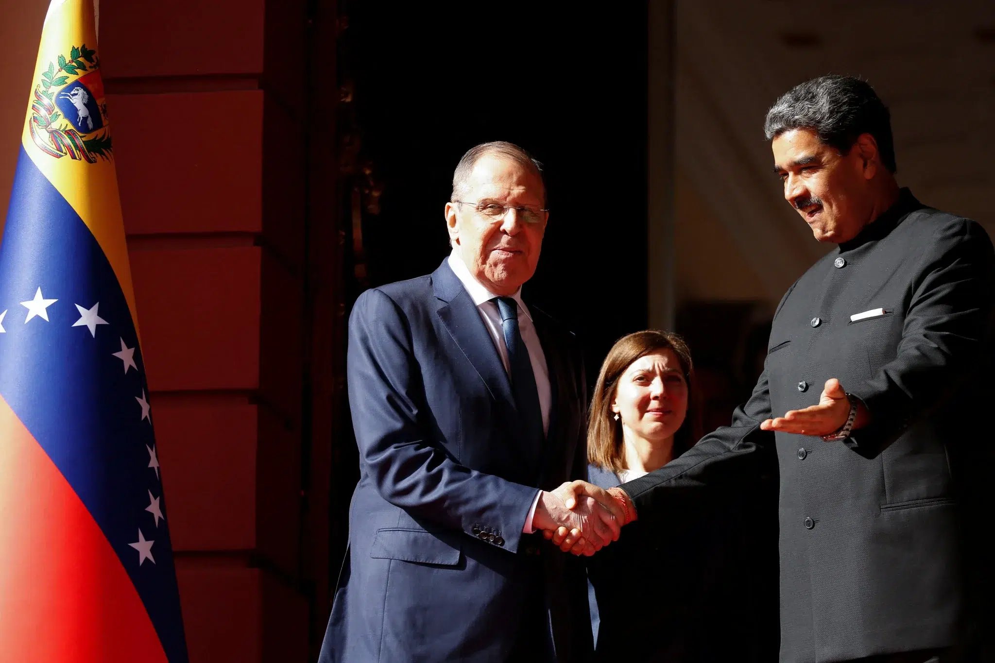 Venezuela's President Nicolás Maduro shakes hands with Russia's Foreign Minister Sergei Lavrov after meeting in Caracas, Venezuela, February 20, 2024. Photo: Leonardo Fernandez Viloria/Reuters.