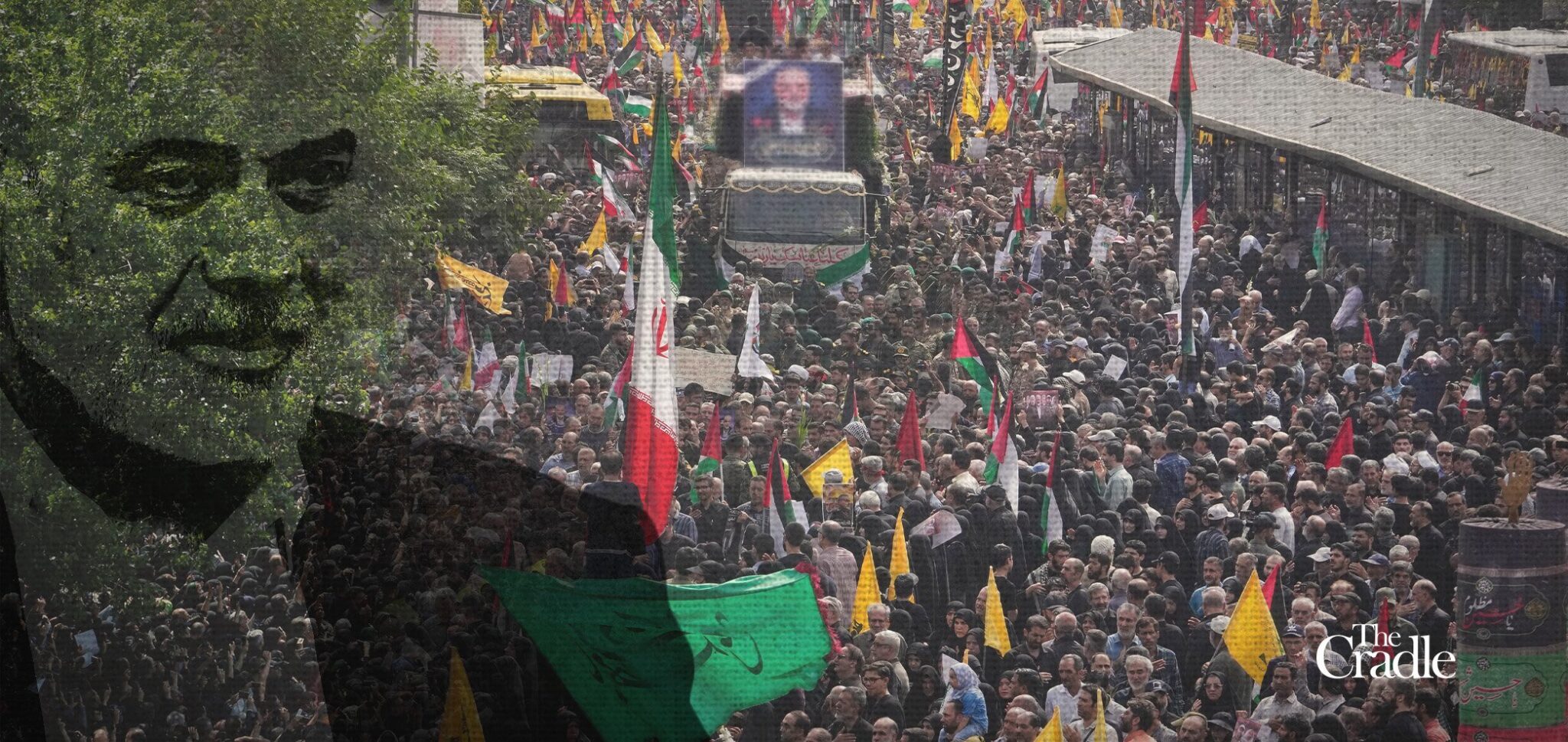 Photo composition showing a massive procession accompanying the remains of Hamas leader Ismail Haniyeh and a watermark of him (left). Photo: The Cradle.
