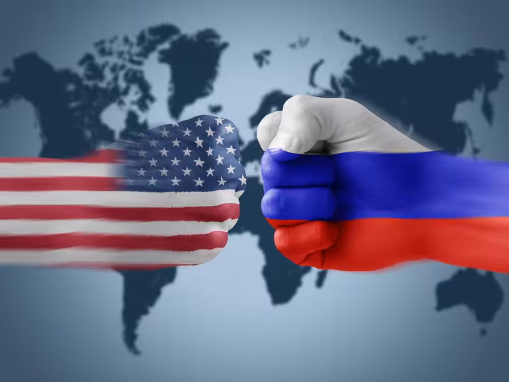 Photo composition of two fists one in front of the other, the one on the left painted with the US flag and the one on the right painted with the Russian flag, and a world map in the background. File photo.