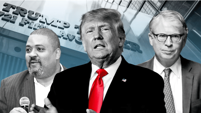 Photo composition showing, from left to right, Alvin Bragg, Donald Trump and Cyrus Vance with the New York City Trump Tower. Photo: Financial Times.