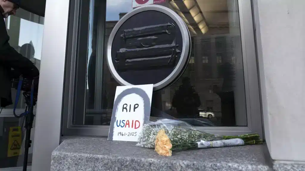 A placard reading "RIP USAID" and a bouquet of flowers placed before the USAID building in Washington, USA. Photo: AP/José Luis Magaña.