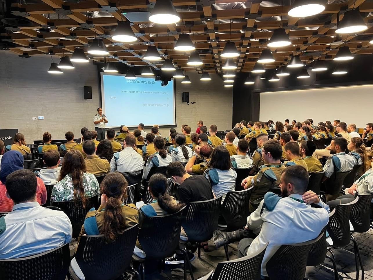 Roughly one month later, on August 2, Lotem’s LinkedIn account published an image of a packed room of IDF soldiers participating in a conference within one of Microsoft’s Israel campuses, described as being led by Lotem’s Shachar logistics unit. The title of the slide in the photo is Hebrew for “The 10 Digital Commandments,” and the second such commandment can be read as the English acronym “RTFM,” meaning “Read The Fucking Manual.”