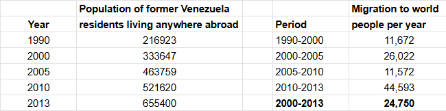 In 2015, Reuters uncritically cited an anti-Chavez academic (Tomas Paez) who claimed that 1.5 million Venezuelans had left Venezuela since Chavez took office in 1999 – in other words that about 100,000 Venezuelans per year had left between 1999 – 2015. World bank figures at the time suggested about 25,000 Venezuelans per year left Venezuela during most of that period, about one quarter the number Reuters had uncritically accepted from Paez, and one twentieth the number El Universal had reported in 2011. [1]