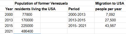 According to Pew Research, Venezuelan migration to the USA averaged 7,000 people per year between 2000 to 2013. It increased to 28,000 per year by 2015; then to about 44,000 per year in the 2015-2020 period. [2] Trump caused migration to accelerate when he dramatically intensified US sanctions on Venezuela in August of 2017, and then again in 2018, 2019 and 2020.[3]