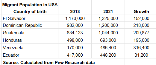 In the case of Ecuador, which has roughly half Venezuela’s population, its migrant population in the US was very close to Venezuela’s in 2021. During the 1990s and early 2000s, migration from Ecuador to the US skyrocketed. As shown in Table 3, between 2013 – 2021 migration slowed tremendously., But as of 2024, Ecuador, which has been under disastrous pro-US rightwing rule since 2017 (as it was during the 1990s and early 2000s) provides the second largest growing Latino migrant community in the US after Venezuela according to Pew Research.[4]