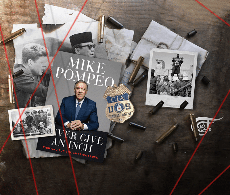 Mike Pompeo's book along with some photos of the US Empire's crimes against humanity. Photo: Al Mayadeen.