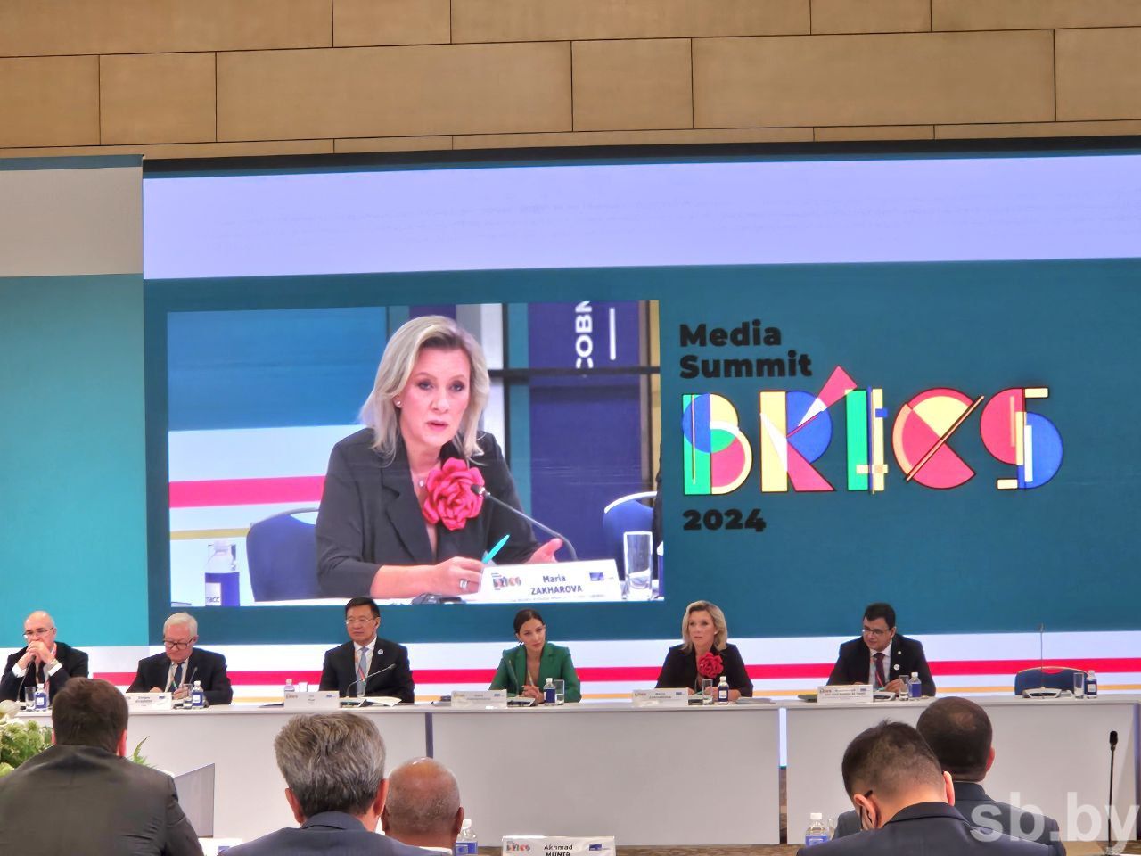 Russia’s Foreign Ministry spokesperson Maria Zakharova speaking during the BRICS Media Summit 2024 in Moscow on Saturday, September 14, 2024. Photo: TASS.