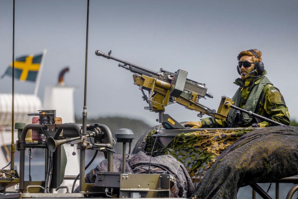 A Swedish soldier on top on an armored military vehicle in what seems to be a military drill. Photo: Getty Images