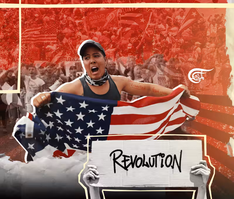 Photo composition showing a Cuban-American woman holding a US flag, calling for overthrow of the Cuban Revolution, and two hands holding up a sign reading "Revolution," describing US-backed color revolutions against anti-imperialist governments around the world. Photo: Al Mayadeen.